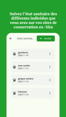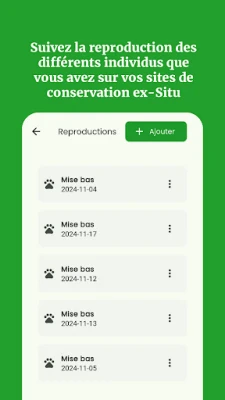 • Enregistrez et consultez les événements de reproduction pour mieux analyser la dynamique des populations.