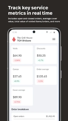 - Key sales metrics: opened and closed orders, average cover value, voids, comps and discounts