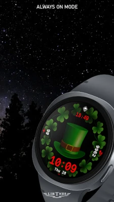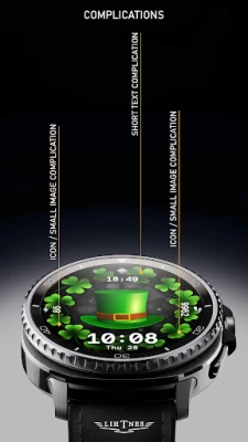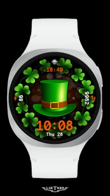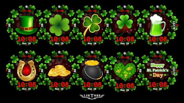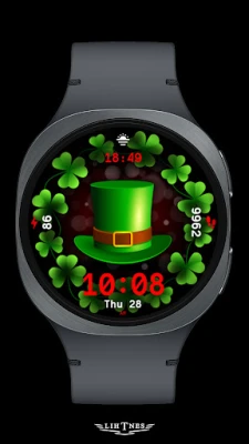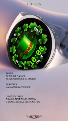 On St. Patrick's Day, people typically wear shamrocks, green clothing, or green accessories. This green-themed watch face is perfect for celebrating St. Patrick's Day in style. The St. Patrick's Day watch face features 10 festive elements that can be changed, along with 14 color themes. It also includes 3 icon/image shortcut complications and 1 short text complication.